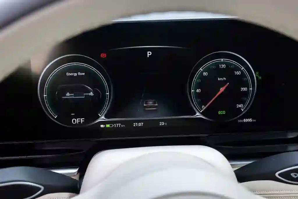 Две модификации, конечно, не две вселенных, но разница принципиальная: первый вариант, использующий в качестве энергии одно электричество, и компромиссный вариант для тех, кто не готов остаться без спасательного круга в виде ДВС, помогающего электродвигателям; причем работать он может как в режиме параллельного, так и последовательного гибрида. На EV запаса хода хватит максимум на 482 км по циклу WLTP, но это паспортные данные. А на деле после 280 км пробега индикатор показал, что батарея высажена на 66 %. Не так плохо, учитывая, что ехал я по дороге со значительным перепадом высот и трафиком разной интенсивности. Но и температура за бортом не падала ниже 23 градусов, а зимой в морозы добиться подобных результатов будет значительно сложнее. Гибридный автомобиль предложит максимальный совокупный пробег в 750 км без дозаправки и подзарядки. На одной электротяге — 82 км. Но это максимально возможный пробег. После 240 км приборы показывали, что и топливо, и энергия закончатся на отметке в 580 км. Зарядка в гибриде — по стандарту Gb/T. Таких станций немного, лучше иметь переходник, и заряжаться от 5 до 100 % придется 4,5 часа. Успокаивает, что эту операцию можно проделывать не часто.